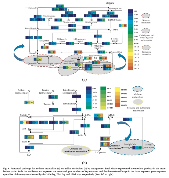 5. 功能基因與代謝途徑:通過(guò)宏基因組學(xué)分析了甲烷代謝和硫代謝關(guān)鍵酶編碼基因的豐度及變化(來(lái)自圖4a,b)。該數(shù)據(jù)從基因功能水平提供了最直接的證據(jù),證明兩條代謝途徑通過(guò)“甲基輔酶M”和“L-半胱氨酸”等關(guān)鍵代謝物相互聯(lián)系、相互促進(jìn)。