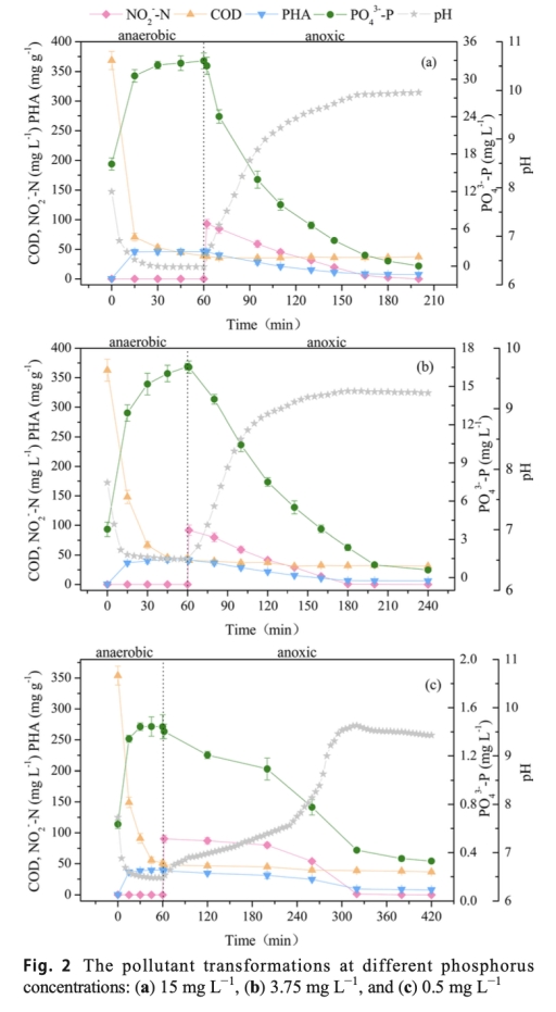 本研究探討了在亞硝酸鹽反硝化除磷(N-DPR)過程中,磷濃度對污染物去除以及一氧化氮(NO)和氧化亞氮(N2O)產生的影響。N-DPR是NO和N2O產生的重要來源,其對環境有強烈的負面影響。結果表明,磷去除效率隨著磷濃度的增加而提高,這是由于在高磷濃度下反硝化聚磷菌(DPAOs)的富集所致。在磷濃度為0.5 mg L?1時觀察到高的NO產量,這主要歸因于還原酶活性恢復緩慢和DPAOs豐度較低。最大的N2O積累量(31.45 mg L?1)也在磷濃度為0.5 mg L?1時達到。可能的原因是低磷濃度下糖原積累菌(GAOs)合成的聚羥基烷酸鹽(PHAs)較少,這會加劇不同還原酶之間的電子競爭。此外,游離亞硝酸(FNA)的抑制是N2O高產量的另一個重要原因。