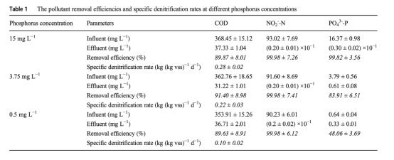 1. 磷濃度對COD和NO??-N的最終去除效率影響不顯著,但對特定反硝化速率和磷去除效率有顯著影響。高磷濃度(15 mg L?1)有利于反硝化聚磷菌(DPAOs)的富集,從而獲得更高的磷去除效率和更快的反硝化速率。