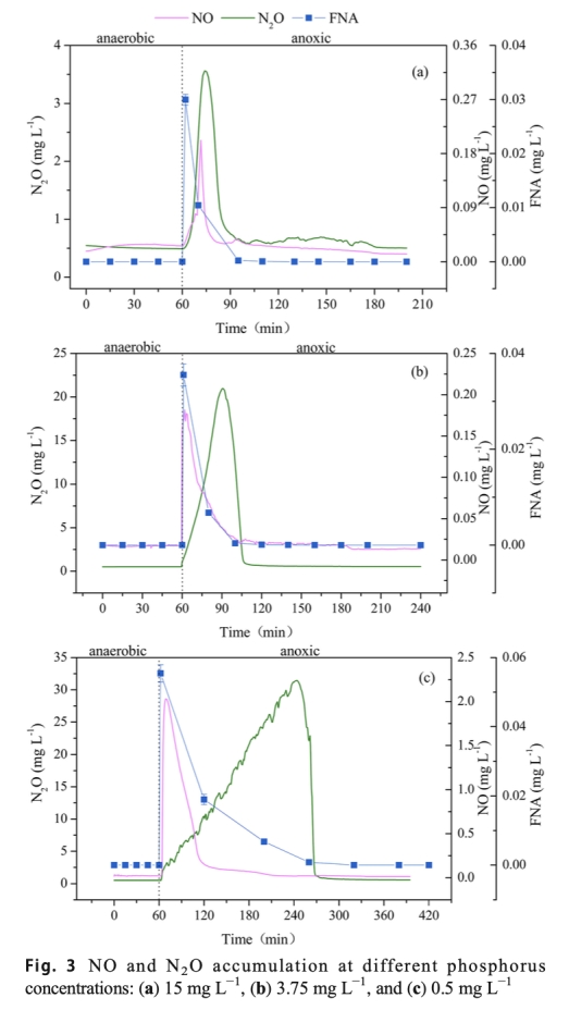2. 低磷濃度(0.5 mg L?1)會導致顯著的一氧化氮(NO)和氧化亞氮(N2O)積累與排放。其排放因子遠高于高磷濃度條件。