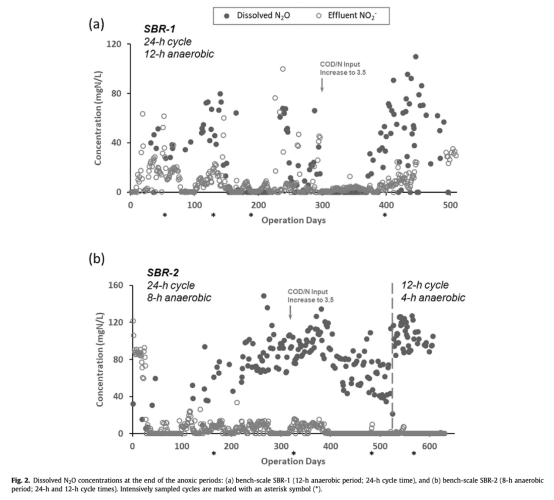 3. 缺氧相的時長需要優化以避免N2O被進一步還原為N2。縮短總循環時間(至12小時)有助于維持高的N2O產率。