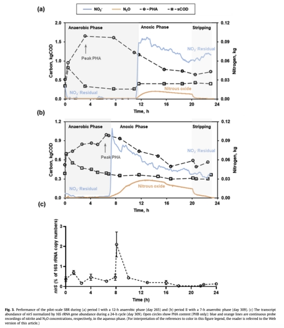 2. 厭氧相的時長對PHA的合成與利用效率至關重要。縮短厭氧相(至4-8小時)可以防止PHA的發酵損失,使其更有效地在后續缺氧相中被用于將NO2-還原為N2O。