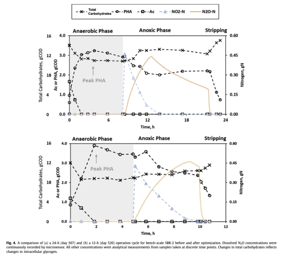 2. PHA與糖原濃度(來自圖3a,b, 圖4):監測整個循環過程中胞內存儲物PHA(PHB, PHBV)和糖原的動態變化。該數據揭示了碳源(乙酸)的儲存與利用效率,證明了短厭氧相有利于防止PHA發酵、提高其后續用于反硝化生成N2O的利用率,是理解電子流向和優化相態時長的核心依據。