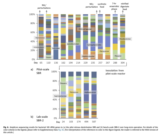 1. 中試規模研究:首先構建并運行一個6 m3的序批式反應器(SBR),處理經亞硝化處理后的厭氧消化離心液,以乙酸為碳源,考察不同COD/N比、循環時間對N2O生產和脫氮性能的影響,并應對上游工藝波動帶來的挑戰。