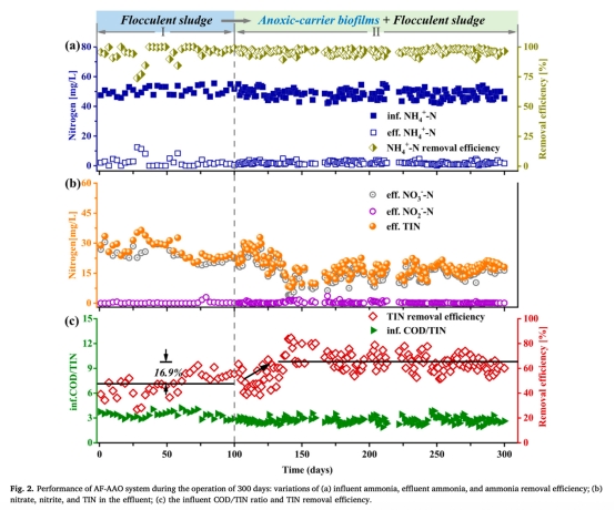 1. 長期水質數據(來自圖2):監測了進水氨氮、出水氨氮及氨氮去除率(圖2a);出水硝酸鹽、亞硝酸鹽及總無機氮TIN濃度(圖2b);進水COD/TIN比及TIN去除效率(圖2c)。該數據直觀展示了集成生物膜后,系統脫氮性能(TIN去除率)的顯著提升(提高了16.9%),證明了該策略在處理低C/N比污水時的有效性。