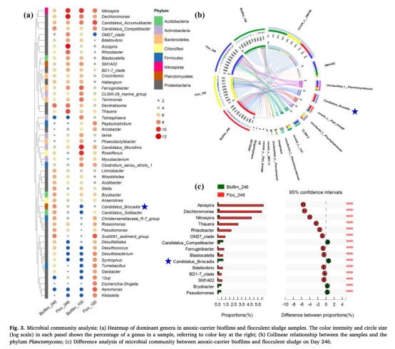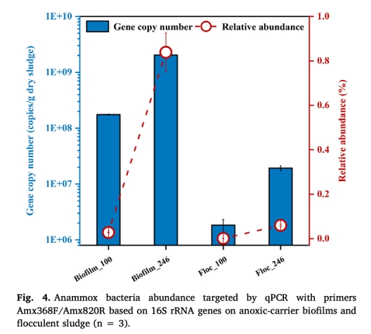2. 微生物群落結構(來自圖3, 圖4):通過16S測序和qPCR分析了缺氧載體生物膜和絮狀污泥中的微生物組成和anammox菌(Ca. Brocadia)的絕對和相對豐度。該數據至關重要地證明了anammox菌在缺氧載體生物膜中(0.69-0.84%)實現了特異性富集,其豐度顯著高于絮狀污泥(0.04-0.06%),揭示了生物膜載體為anammox菌提供了適宜生存的微環境(長SRT、缺氧條件),這是其能夠存在于主流系統的關鍵。