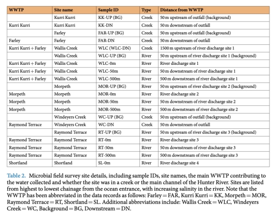 1. 研究區域與采樣設計:選擇澳大利亞新南威爾士州的Hunter河口作為研究區域,該河口接收來自多個污水處理廠(WWTP)的經三級處理后的廢水。在河口的上下游設置了20個采樣點(見表2),于2016年11月和2017年2月( Austral夏季)進行了兩次大規模野外調查采樣。