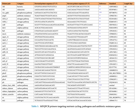? 微生物豐度與活性:使用流式細胞術(Flow Cytometry)定量總細菌細胞和含葉綠素a的藻類細胞的數量和大小;使用微流體定量PCR(MFQPCR)定量與營養循環(C, N, P, S)、抗生素抗性和病原體相關的功能基因的絕對豐度(見表3)。