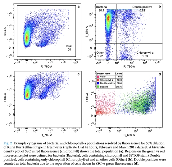 3. 流式細胞術數據(圖2為例圖):提供了總細菌和藻類細胞的絕對數量以及細胞大小信息。該數據直接反映了微生物的生物量和生長狀況,是評估廢水促進或抑制微生物生長的最直觀指標。