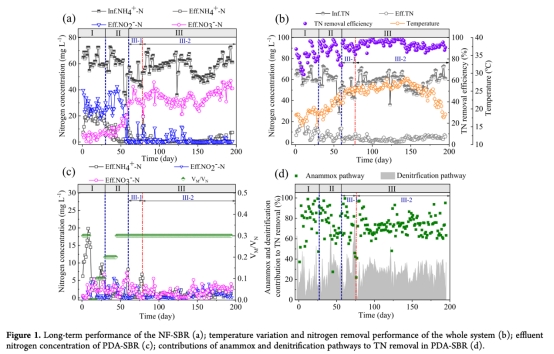 1. 長期水質(zhì)數(shù)據(jù)(來自圖1,表1):監(jiān)測了NF-SBR和PD/A-SBR進(jìn)出水的NH??-N、NO??-N、NO??-N、TN、COD濃度。該數(shù)據(jù)直接證明了PD/A工藝在溫度波動和進(jìn)水變化下,能持續(xù)實(shí)現(xiàn)高效脫氮(TN去除率>93.7%,出水TN<5 mg L?1)和有機(jī)物去除,展示了其卓越的穩(wěn)定性和處理效果。
