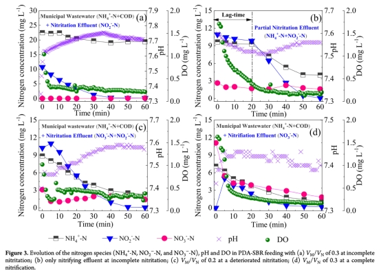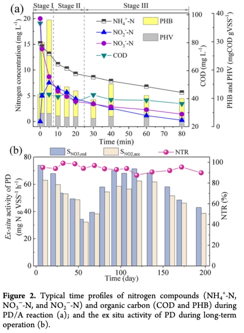 3. 典型周期轉(zhuǎn)化曲線(來自圖2a, 圖3):展示了PD/A-SBR一個反應(yīng)周期內(nèi)氮化物(NH??-N, NO??-N, NO??-N)和有機(jī)物(COD, PHA)濃度的動態(tài)變化。該數(shù)據(jù)直觀揭示了“PD快速產(chǎn)生NO??-N”與“anammox同步消耗NH??-N和NO??-N”的耦合過程,以及內(nèi)碳源(PHA)在后續(xù)反硝化中的作用,為理解工藝內(nèi)在反應(yīng)機(jī)制提供了時間序列證據(jù)。
