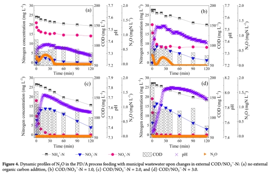 3. 揭示N?O產(chǎn)生與操作條件的關(guān)聯(lián):通過關(guān)聯(lián)不同外碳源(乙酸)投加量(COD/NO??-N比)與N?O的動態(tài)曲線,發(fā)現(xiàn)當(dāng)外碳源充足(COD/NO??-N ≥ 2)時,N?O幾乎不積累;而當(dāng)碳源受限時,會出現(xiàn)短暫且低濃度的N?O峰值。這揭示了碳源充足是抑制PD/A工藝N?O產(chǎn)生的關(guān)鍵操作條件,為優(yōu)化工藝運(yùn)行、最小化溫室氣體排放提供了明確指導(dǎo)。