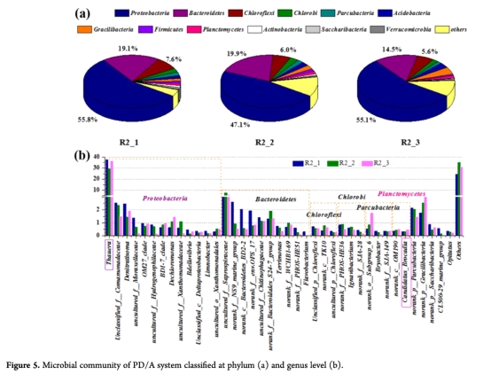 5. 微生物群落結(jié)構(gòu)數(shù)據(jù)(來自圖5):通過高通量測序獲得了不同運(yùn)行時間點(diǎn)污泥微生物群落在門水平和屬水平的組成。該數(shù)據(jù)表明Thauera(PD功能菌)和Ca. Brocadia(anammox菌)在整個運(yùn)行過程中持續(xù)存在并成為關(guān)鍵功能菌屬,從微生物生態(tài)學(xué)角度解釋了工藝功能穩(wěn)定性的原因。