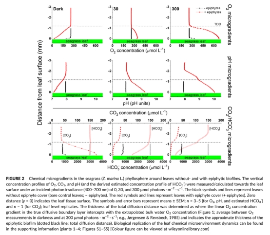 本研究旨在探究附生生物膜如何影響海草(大葉藻 Zostera marina L.)葉圈(phyllosphere)的關(guān)鍵物理化學(xué)條件和過程,特別是其對葉片微環(huán)境的pH、O2和無機碳(CO2, HCO3-)可用性的影響,以及由此引發(fā)的對海草光合作用和呼吸作用的生理生態(tài)效應(yīng)。