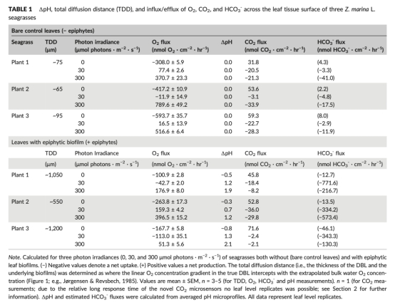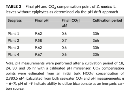 6. 最終pH和CO2補償點(表2):通過pH漂移實驗測定。研究意義:確定了該種海草利用HCO3-的能力(最終pH > 9)和維持光合作用所需的最低CO2濃度(~0.6 μM),為解釋微傳感器數(shù)據(jù)提供了關(guān)鍵的生理閾值。