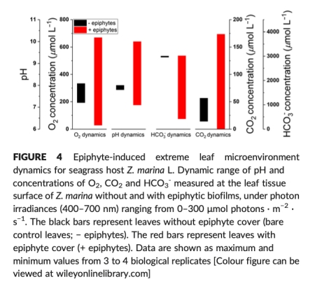 Strong leaf surface basification and CO2 limitation of seagrass induced by epiphytic biofilm microenvironments