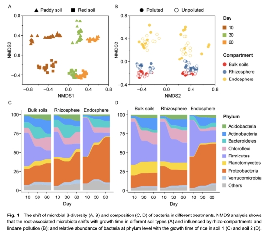 1. 水稻根際微生物組裝受生長時間、土壤類型和根區 compartment 的顯著調控,而林丹污染主要通過刺激根內微生物組構建產生影響