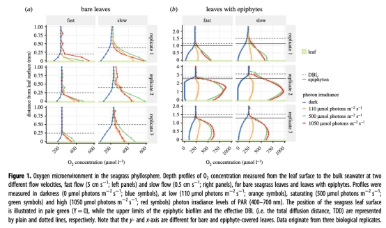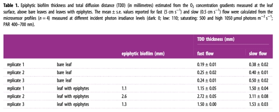 ? 測量數(shù)據(jù):附生生物使總擴散距離(TDD)增加6倍(最厚達3.11 mm),黑暗時葉面O?降低79-97%