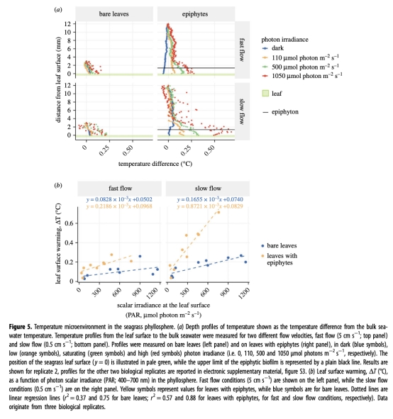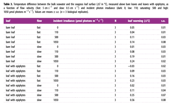 ? 溫度微傳感器:首次記錄到海草葉際TBL的存在,發(fā)現(xiàn)附生生物導(dǎo)致葉面升溫0.56°C(表3)