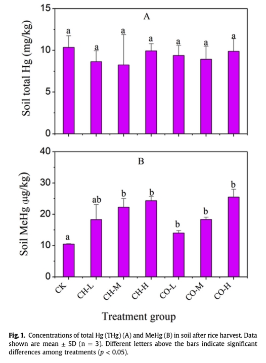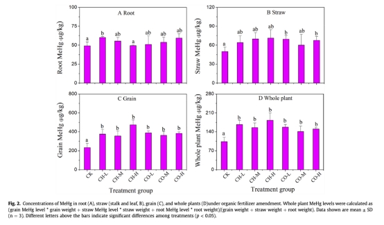 1. 有機肥料(0.1-1%添加量)使土壤MeHg濃度增加34-143%,稻米MeHg積累量最高增加203%(圖2C)。