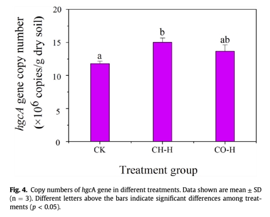 ? 數據:hgcA基因拷貝數在CH處理中顯著增加(圖4);Syntrophobacteraceae和Desulfovibrionaceae(硫酸鹽還原菌)豐度上升。