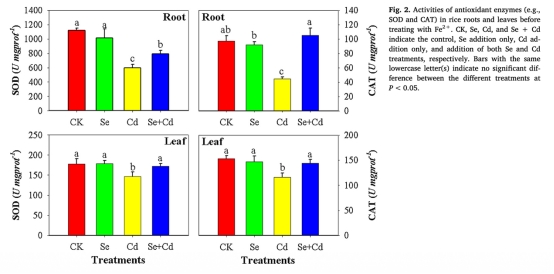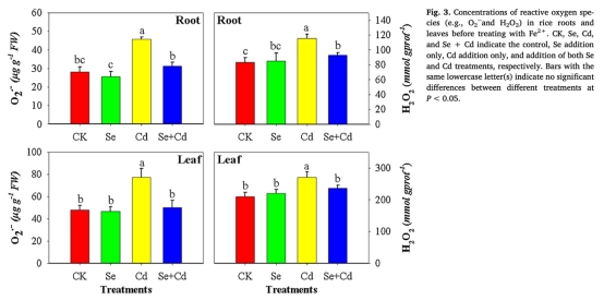 3. ROS水平(O2-和H2O2):來自圖3。研究意義:Cd增加了ROS水平(根O2-增加62.4%,H2O2增加39.2%),而Se降低了這些水平(根O2-減少31.7%,H2O2減少19.5%)。該數據證實了Se能有效清除ROS,減少氧化損傷。
