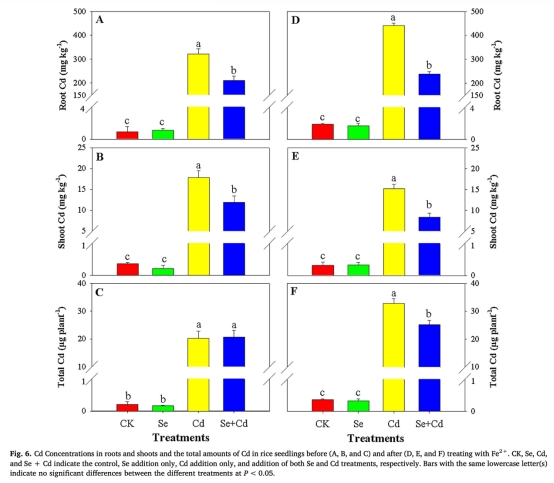 5. 鐵膜形成(DCB-extractable Fe和Cd在鐵膜中的總量):來自圖5。研究意義:Cd減少了鐵膜形成(DCB-extractable Fe減少74.5%),而Se增強了它(增加198%);Cd在鐵膜中的總量在Se+ Cd處理中增加了318%。該數據表明Se通過促進鐵膜作為物理屏障吸附Cd,減少Cd進入根系。
