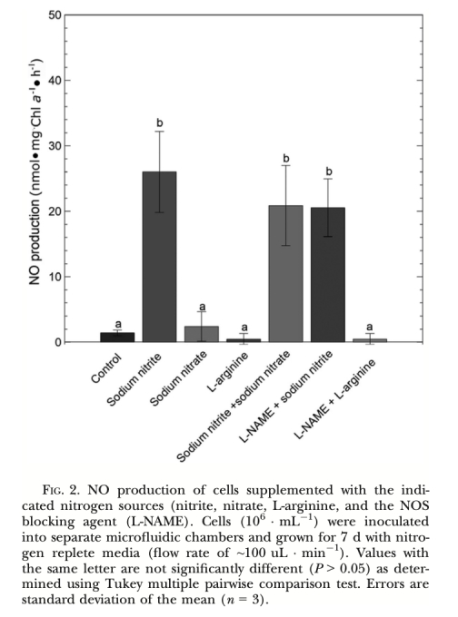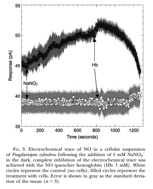 1. NO產生速率 (圖2, 圖3, 圖4, 圖5, 圖6, 圖7): 使用Unisense電極測量。意義: 直接量化不同處理(氮源、光照、抑制劑、溫度、鹽度)下細胞產生的NO量,是確定產生途徑和環境響應的核心證據。圖2/圖3證明亞硝酸鹽依賴的NR途徑是主要來源;圖4/圖5/圖6證明光抑制及其與光合電子鏈的關聯;圖7證明溫鹽脅迫的誘導作用。