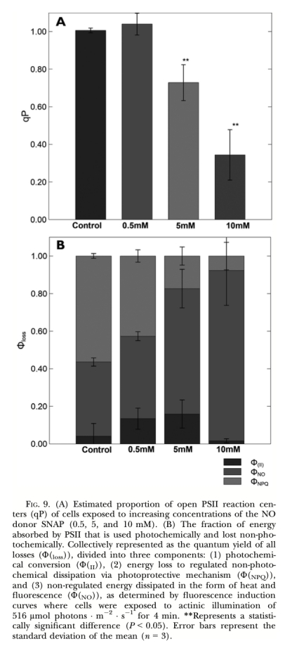 ? 能量分配組分 (ΦII, ΦNPQ, ΦNO, 圖9B): 分別代表用于光化學轉化的能量、通過調節機制耗散的能量、非調節性耗散的能量。意義: 外源NO降低ΦNPQ而增加ΦNO(圖9B),表明NO破壞了依賴類胡蘿卜素/葉黃素循環的調節性能量耗散機制,導致更多能量以非調節性方式(可能造成損傷)耗散。