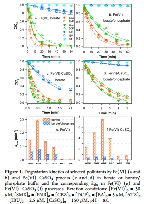 高效氧化:Fe(VI)-CaSO?過程能快速降解多種有機污染物,速率顯著高于Fe(VI)單獨作用,尤其在硼酸鹽緩沖液中效果更佳。