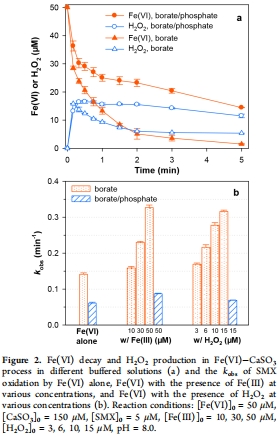數據來源:圖2a顯示在不同緩沖液中Fe(VI)濃度隨時間下降和H?O?的積累動態。