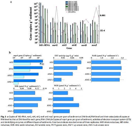 意義:NIR和NOS活性在HYZ和ANZ-1層最高,與基因表達(dá)一致,證實(shí)這些層的完整反硝化功能(NO??→N?)。ETS活性在深層(ANZ-2)降低,反映微生物代謝活性隨深度下降。