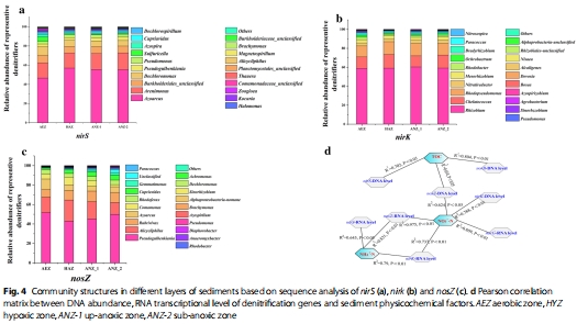 垂直分層效應(yīng):反硝化菌的豐度、表達(dá)和活性具有明顯的垂直分帶性:好氧層(AEZ)以norB為標(biāo)志,缺氧層(HYZ)以nirS為標(biāo)志,上部厭氧層(ANZ-1)以nosZ為標(biāo)志。HYZ和ANZ-1層是氮去除最活躍的區(qū)域。