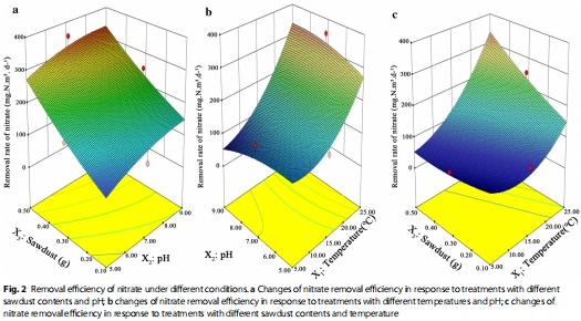 優(yōu)化反硝化條件:利用響應(yīng)面法(RSM)確定溫度、pH和鋸屑含量對(duì)沉積物反硝化效率(硝酸鹽去除率)的最佳組合。