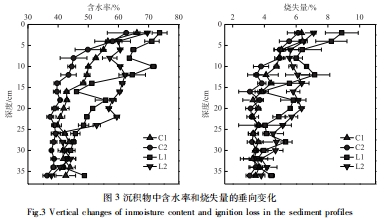 意義:LOI間接反映了有機質含量。數據顯示湖濱帶沉積物含水率和LOI均高于開敞湖區,且表層15 cm內數值最高,表明藻源性有機質主要堆積在表層,使其成為有機質降解和化學反應最活躍的層段。