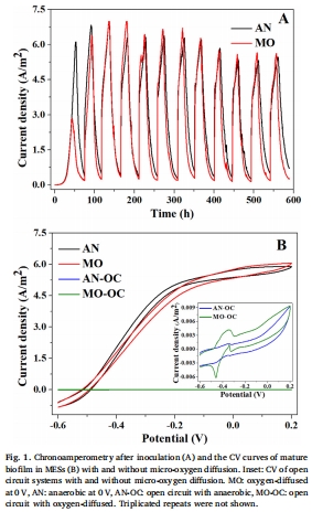 研究意義:數據顯示微氧條件在初期會暫時降低電流密度,但經過適應期后,能達到與厭氧系統相當的最大電流密度。這表明電活性細菌(如Geobacter)能夠耐受并適應微氧環境,為在微氧條件下應用MES技術提供了可能性。