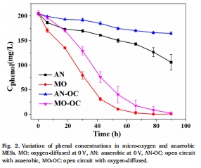 微氧條件是實現苯酚在MES中快速完全降解的關鍵,且經過適應后不影響電流產生。