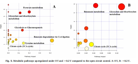數據來源:圖5 和圖6 展示了在0V和-0.2V電位下,相較于開路對照,被顯著上調的代謝通路以及推測的代謝網絡。