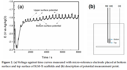 數(shù)據(jù)來源:圖2 展示了使用Unisense微電極測量的SLM-Ti支架頂部和底部表面電位隨時間的變化曲線。