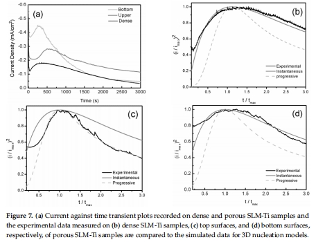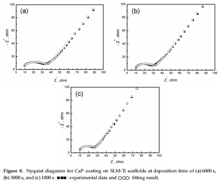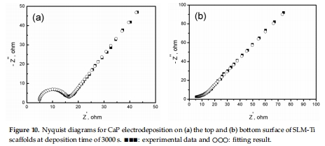 本研究成功在三維多孔SLM-Ti支架表面電沉積了磷酸鈣(CaP)涂層。原位測量顯示,由于CaP涂層導(dǎo)電性較低,在5毫米厚的多孔SLM-Ti樣品內(nèi)部存在約80 mV的電位變化。掃描電鏡觀察表明,涂層形貌取決于多孔SLM-Ti電極表面位置與輔助電極之間的距離。對比電化學(xué)實驗發(fā)現(xiàn),支架的頂部和底部表面分別表現(xiàn)出連續(xù)成核和瞬時成核行為。電化學(xué)阻抗譜結(jié)果進(jìn)一步表明,支架不同深度的電沉積過程并不同步。這些差異最終都是由多孔Ti電極內(nèi)部電位和電流分布不均勻引起的。本研究為深入理解SLM-Ti支架三維表面電化學(xué)過程機理提供了基礎(chǔ)研究方法。