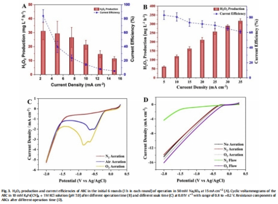 數據來源:圖2 展示了ABC陰極在初始多個運行輪次中的H?O?產率變化(A),以及在不同運行時間后的CV曲線(B)和電阻成分變化(D)。
