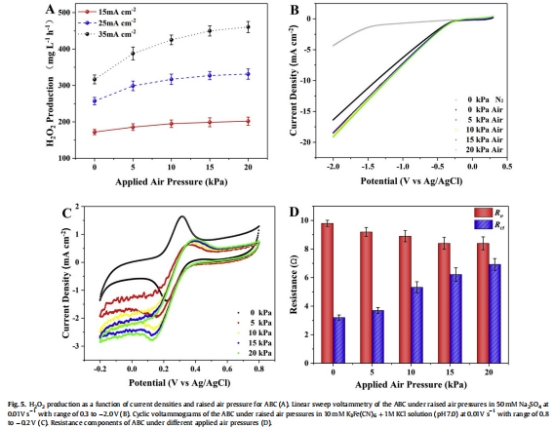 數據來源:圖5 展示了在不同加壓空氣條件下,ABC陰極的H?O?產率與電流效率(A)以及LSV/CV曲線(B, C)的變化。