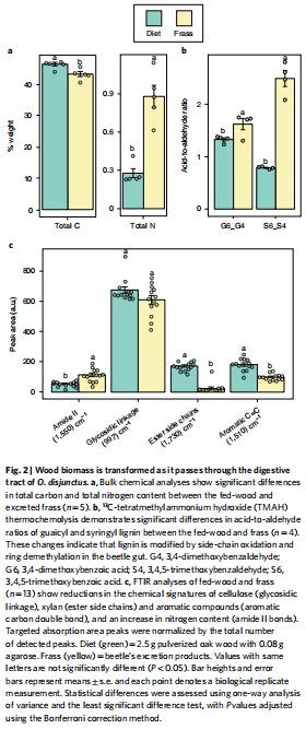 化學(xué)表征:綜合利用傅里葉變換紅外光譜(FTIR)、熱化學(xué)裂解-氣相色譜質(zhì)譜(TMAH-GC/MS) 和核磁共振(NMR),對比分析甲蟲攝入的橡木和排出的糞便(frass)在化學(xué)組成上的變化,從宏觀上確認(rèn)木質(zhì)纖維素(纖維素、半纖維素、木質(zhì)素)的降解和轉(zhuǎn)化。