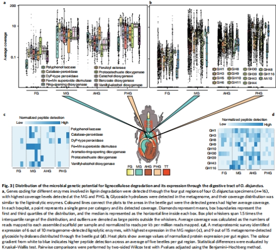 本研究揭示了木食性甲蟲Odontotaenius disjunctus如何通過其高度分化的腸道解剖結(jié)構(gòu)和空間組織有序的微生物功能組裝,高效地解構(gòu)木質(zhì)纖維素并從中提取能量。研究通過綜合化學(xué)分析、宏基因組學(xué)和宏蛋白質(zhì)組學(xué)方法證明,木質(zhì)纖維素的解聚和發(fā)酵過程在腸道的四個主要區(qū)室中順序發(fā)生。中腸(Midgut, MG)較高的氧氣濃度驅(qū)動木質(zhì)素和纖維素的解聚,而前腸(Anterior Hindgut, AHG)較厚的腸壁減少了氧氣擴(kuò)散,促進(jìn)了氫氣積累,從而創(chuàng)造了有利于發(fā)酵、同型產(chǎn)乙酸和固氮作用的厭氧環(huán)境。研究還證明解聚過程在后腸(Posterior Hindgut, PHG)仍在繼續(xù),并且甲蟲排出的糞便是能量和營養(yǎng)極其豐富的產(chǎn)物,其后代依賴此糞便生存和發(fā)育。該研究闡明了宿主通過塑造特定的腸道物理化學(xué)棲息地來選擇并促進(jìn)關(guān)鍵微生物代謝功能,從而實(shí)現(xiàn)對極度貧營養(yǎng)飲食的利用和群體延續(xù)。