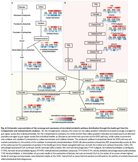 數(shù)據(jù)來源:圖3 展示了參與木質(zhì)素降解(a, c)和碳水化合物活性酶(b, d)的基因覆蓋度(宏基因組)和蛋白表達(dá)量(宏蛋白質(zhì)組)在腸道各區(qū)域的分布。圖4 通過示意圖整合了宏組學(xué)數(shù)據(jù),展示了主要代謝途徑(如EMP途徑、磷酸酮醇酶途徑、Wood-Ljungdahl途徑)的空間分布。