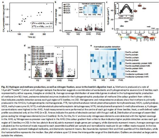 研究意義:圖5c 是關(guān)鍵數(shù)據(jù)之一,它顯示氫氣濃度在AHG區(qū)域達(dá)到最高(33-44 μM)。這一高氫分壓環(huán)境抑制了產(chǎn)甲烷作用(因其熱力學(xué)不利),促進(jìn)了同型產(chǎn)乙酸作用(將H?和CO?轉(zhuǎn)化為乙酸,為宿主提供能量)。同時,圖5d,e 表明固氮作用(氮酶)也主要在AHG區(qū)域高度活躍,解釋了糞便氮含量升高的直接原因。這些數(shù)據(jù)揭示了AHG作為一個獨(dú)特的厭氧生物反應(yīng)器,其功能深受其物理結(jié)構(gòu)(厚壁防氧滲入)塑造的化學(xué)環(huán)境(高H?)所調(diào)控。