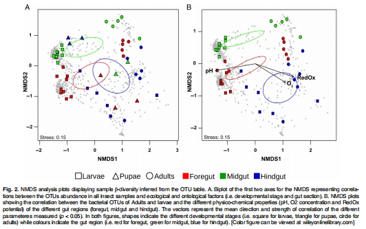 將微生物生態(tài)分布與具體的環(huán)境驅(qū)動因子直接鏈接:本研究沒有停留在觀察到“菌群不同”的現(xiàn)象上,而是通過Unisense電極測得了“為何不同”的原因。通過圖2B 的NMDS擬合分析,研究將菌群結(jié)構(gòu)數(shù)據(jù)與物理化學(xué)數(shù)據(jù)進(jìn)行了統(tǒng)計關(guān)聯(lián)。結(jié)果顯示,幼蟲腸道的高pH值是其菌群結(jié)構(gòu)的主要塑造者,而成蟲腸道菌群則主要受氧氣水平和氧化還原電位的控制。這種定量化的關(guān)聯(lián)性分析極大地增強(qiáng)了結(jié)論的說服力,從“相關(guān)”推進(jìn)到了“機(jī)理”闡釋的層面。