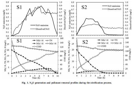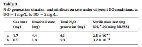 數據:DO=1 mg/L時,N2O總生成量是DO=2 mg/L時的2.6倍。硝化速率隨DO升高而增加(從2.5×10?2增至3.2×10?2 mg NH4+-N/(min·g MLVSS))。