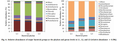 數據:高通量測序顯示,大絮體(L3)中反硝化菌總相對豐度(31.5%)高于小絮體(L1, 17.8%)。FISH結果顯示,AOB和NOB主要分布在絮體表面,而反硝化菌富集在絮體內部。