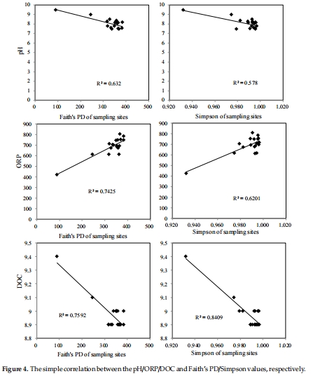 pH、DOC和ORP是驅(qū)動微生物群落結(jié)構(gòu)和多樣性的最關(guān)鍵環(huán)境因子。pH和DOC升高、ORP降低對微生物多樣性產(chǎn)生負(fù)面影響。